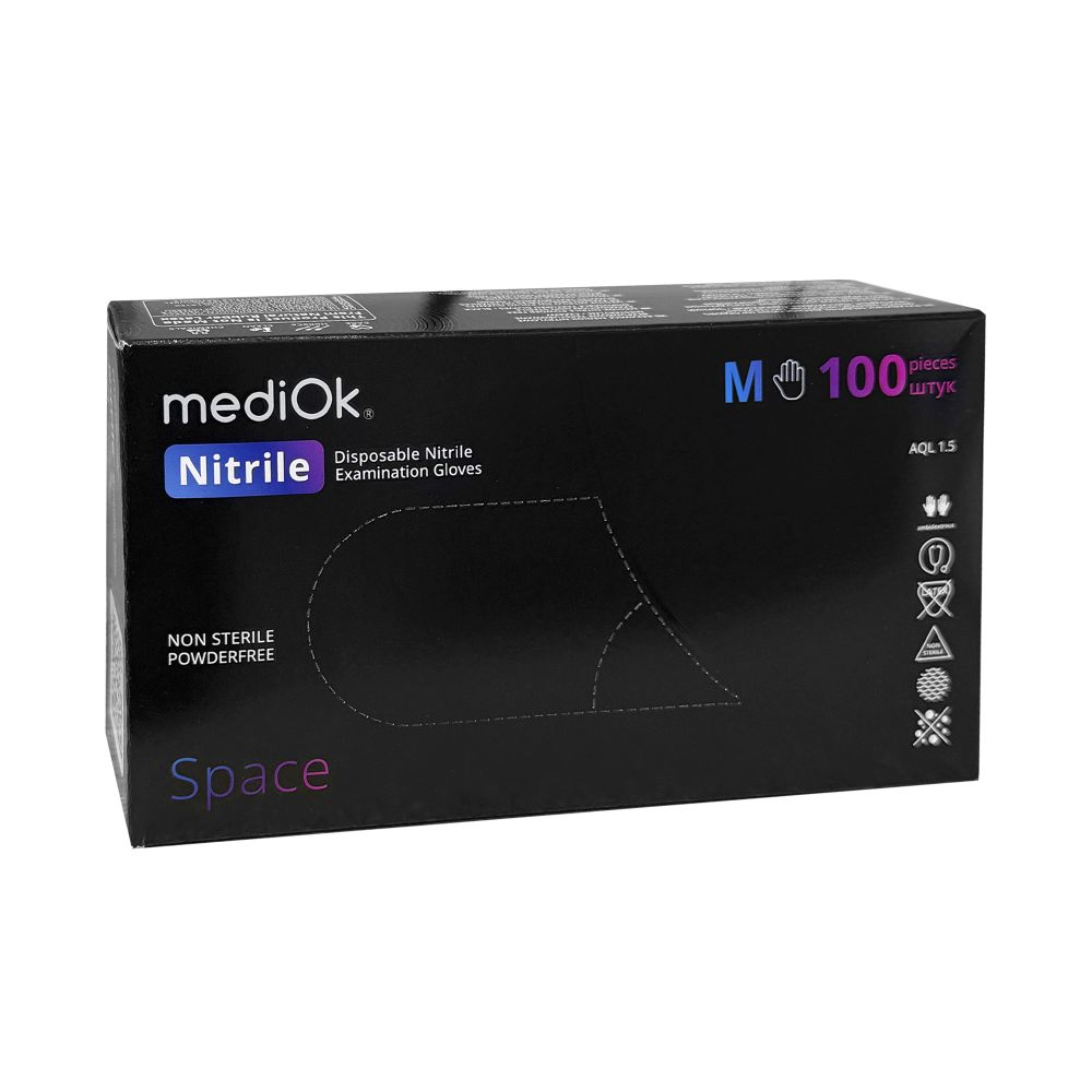 Перчатки нитриловые неопудреные MediOk текстурированые хлорированые черные, М, 100шт/пач